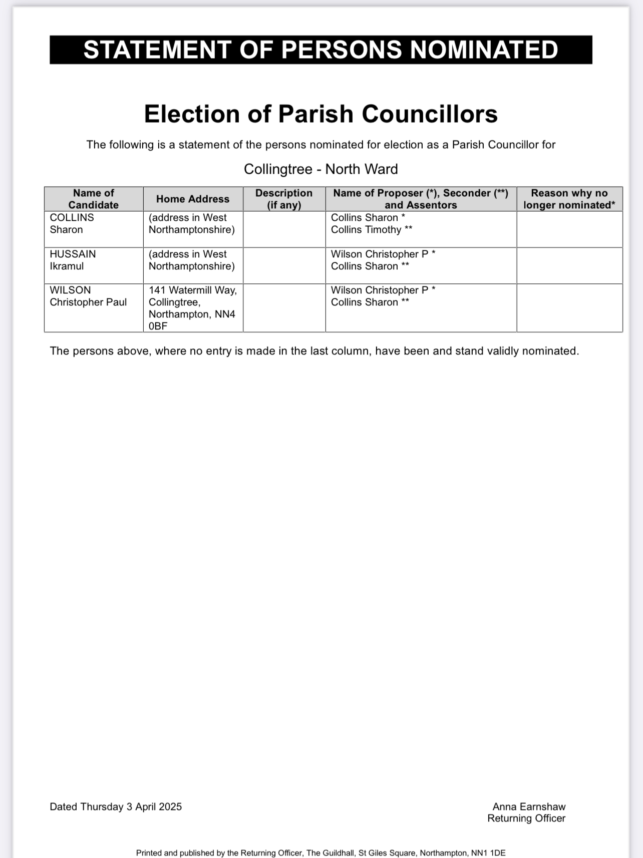 Due to expected numbers, WNC will be running an appointment system for the submission of nomination papers. Appointments are 15-minute slots and can be booked by emailing ReturningOfficer@westnorthants.gov.uk with your name, date and time you’d like to come in and a contact telephone number or calling the Elections Team on 01604 526130. A member of the team will then contact you to arrange a date and time. You are welcome to just “turn up” at any of the locations during the dates and times given, however you may be required to wait until an officer is free to take your nomination paper and process it.